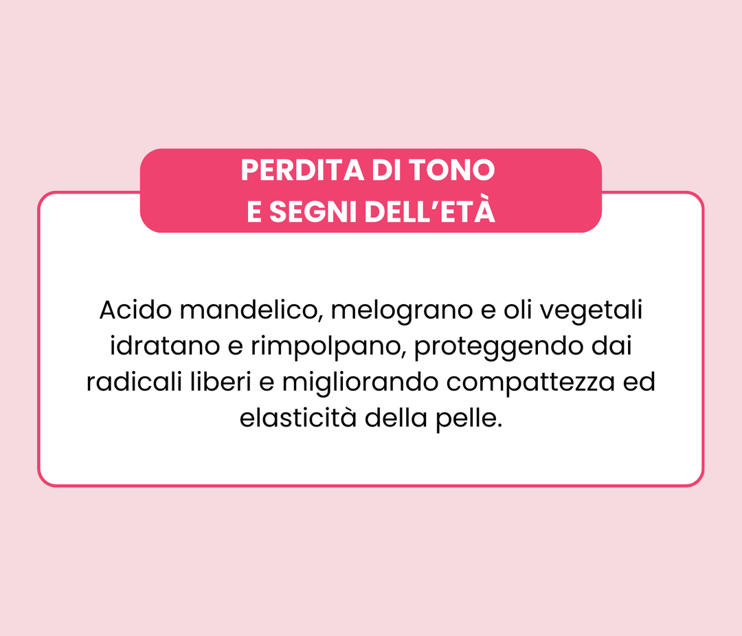 Enzimi da papaia e ananas, estratto di melograno, ribes nigrum, acido mandelico, microgranuli sferici di noce, aloe, caolino, burro di karitè, oli vegetali: oliva, girasole, cocco, vinaccioli