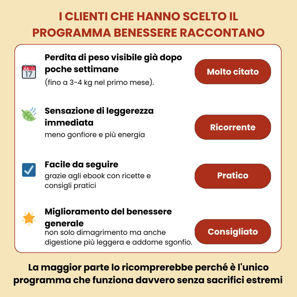 Ogni programma è un percorso completo che include integratori specifici, una guida dettagliata con piano alimentare e il nostro supporto diretto per ogni dubbio.
