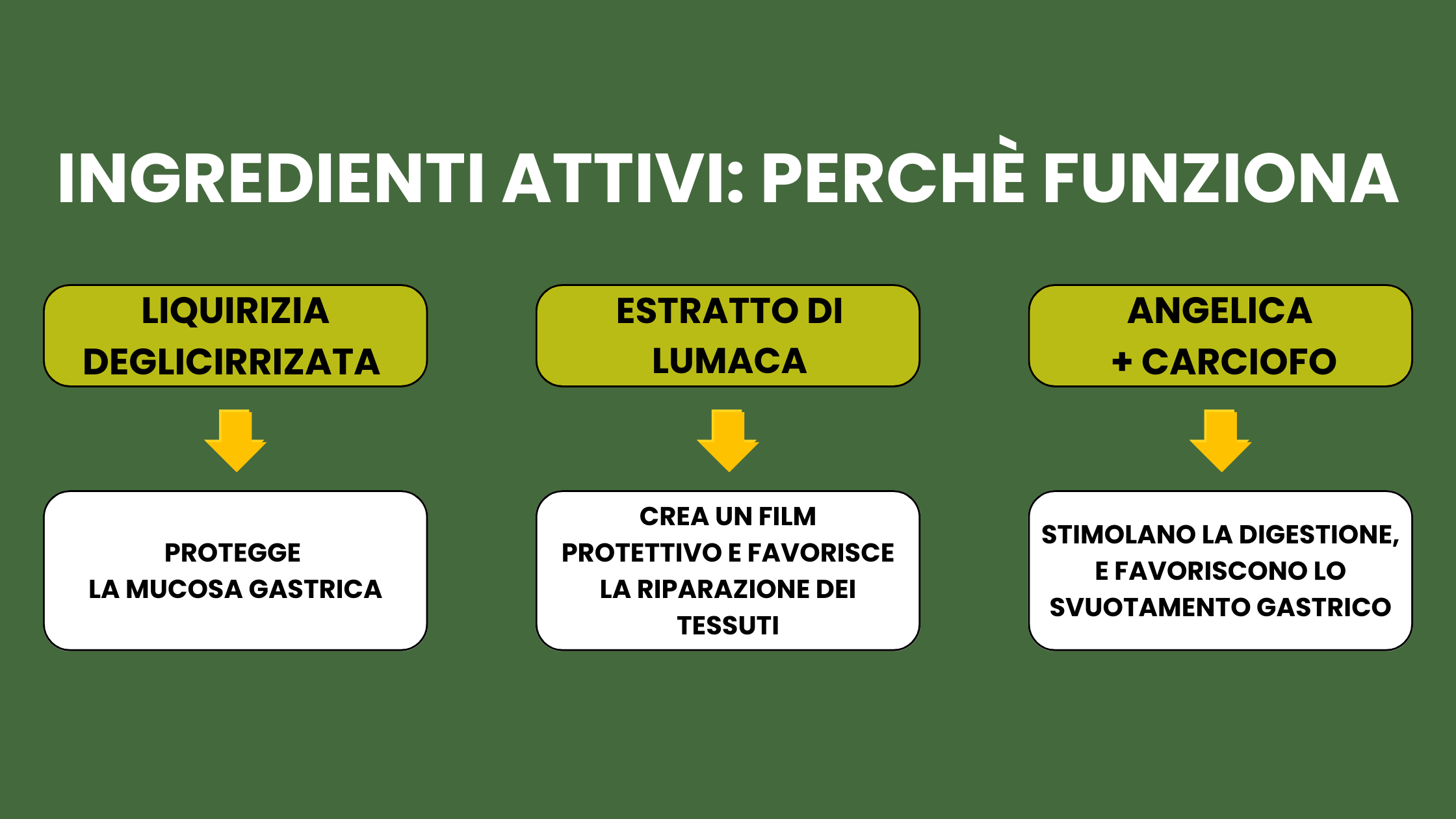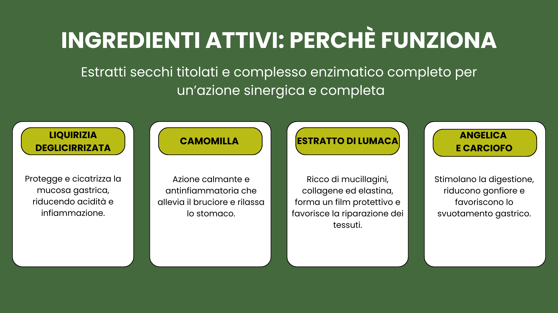 L’unico rimedio naturale che non si limita a tamponare l’acidità: crea una barriera protettiva, rigenera la mucosa gastrica e migliora la digestione. Sollievo immediato da reflusso, bruciore e pesantezza, senza effetti collaterali. Formula unica con estratto di lumaca, sicura e adatta a tutta la famiglia.