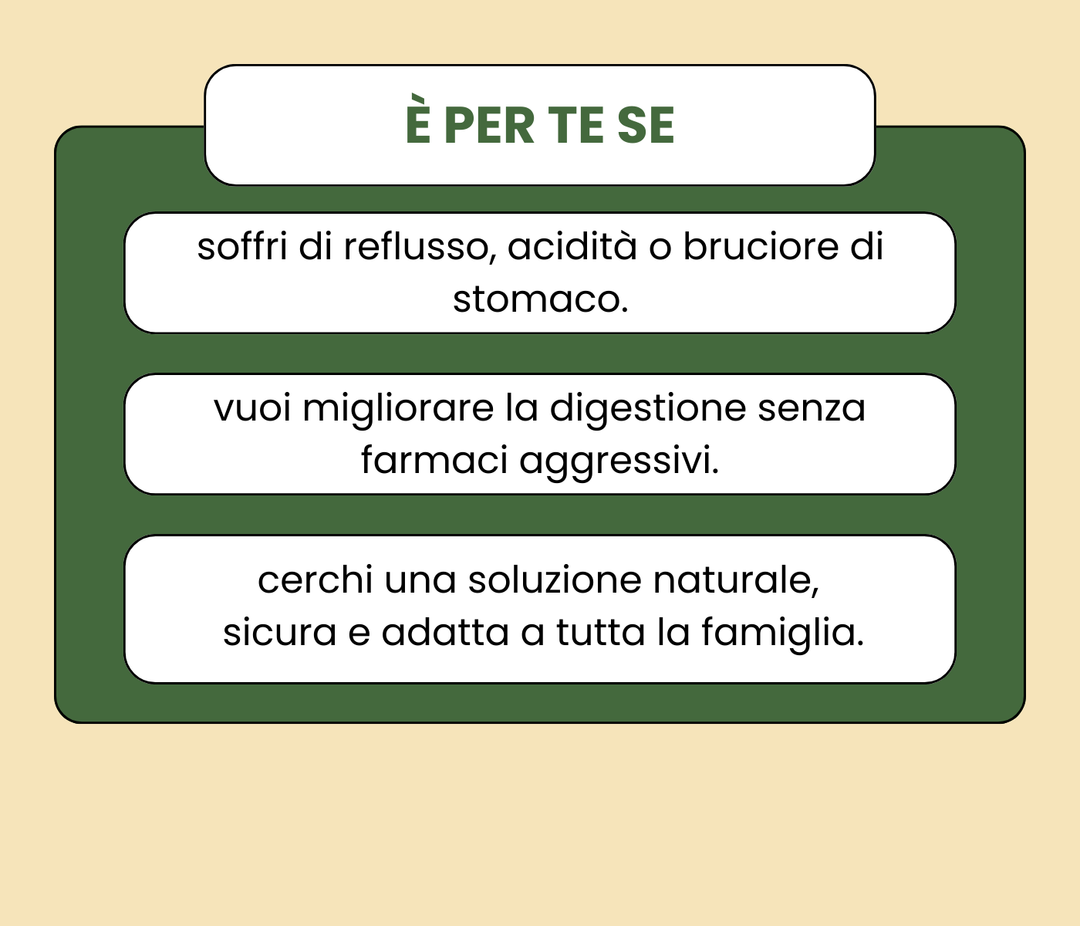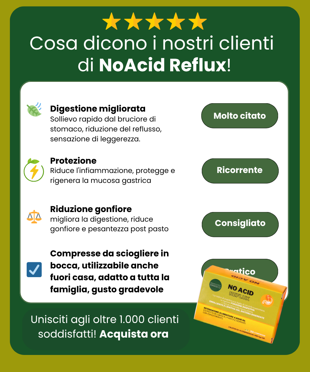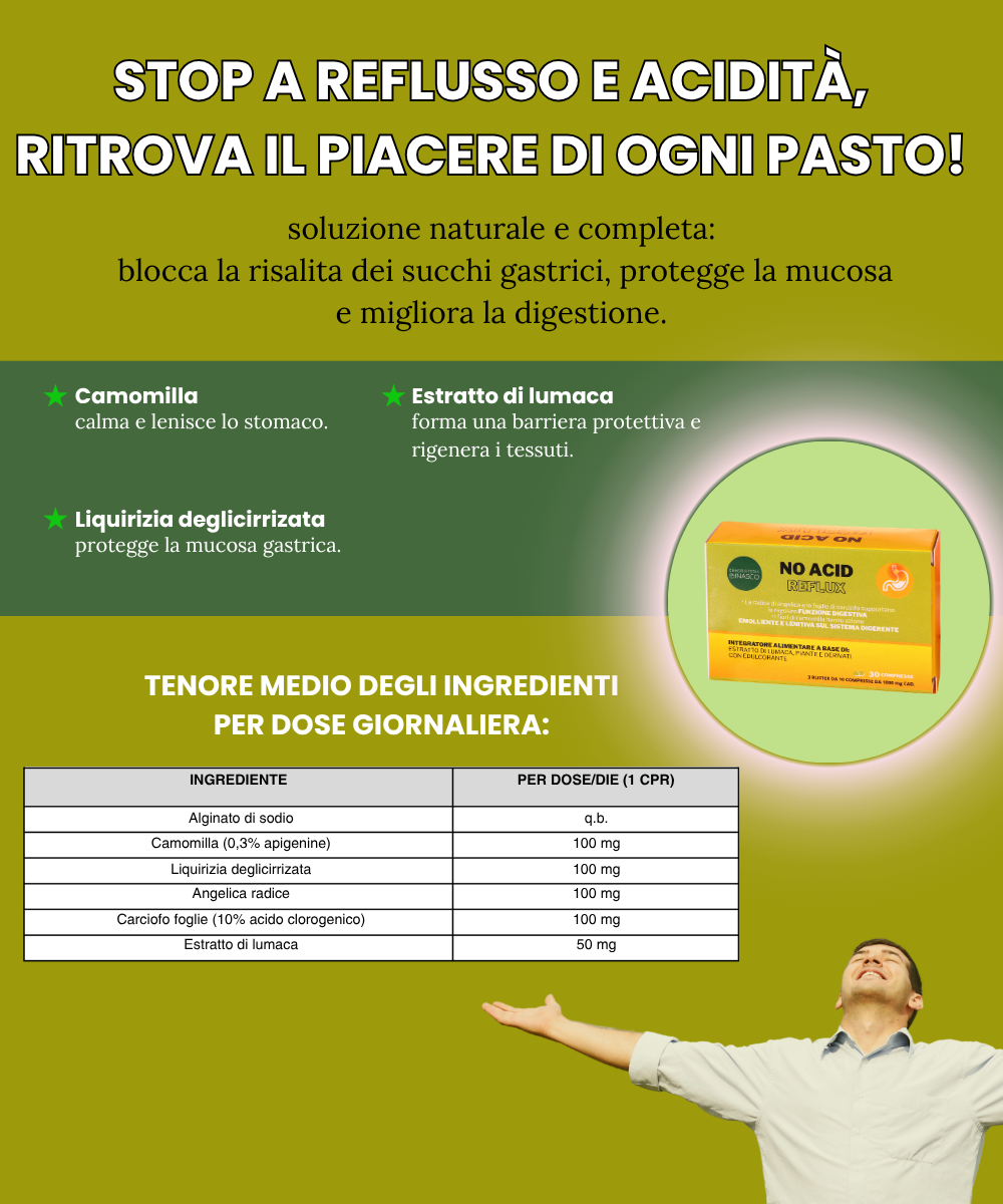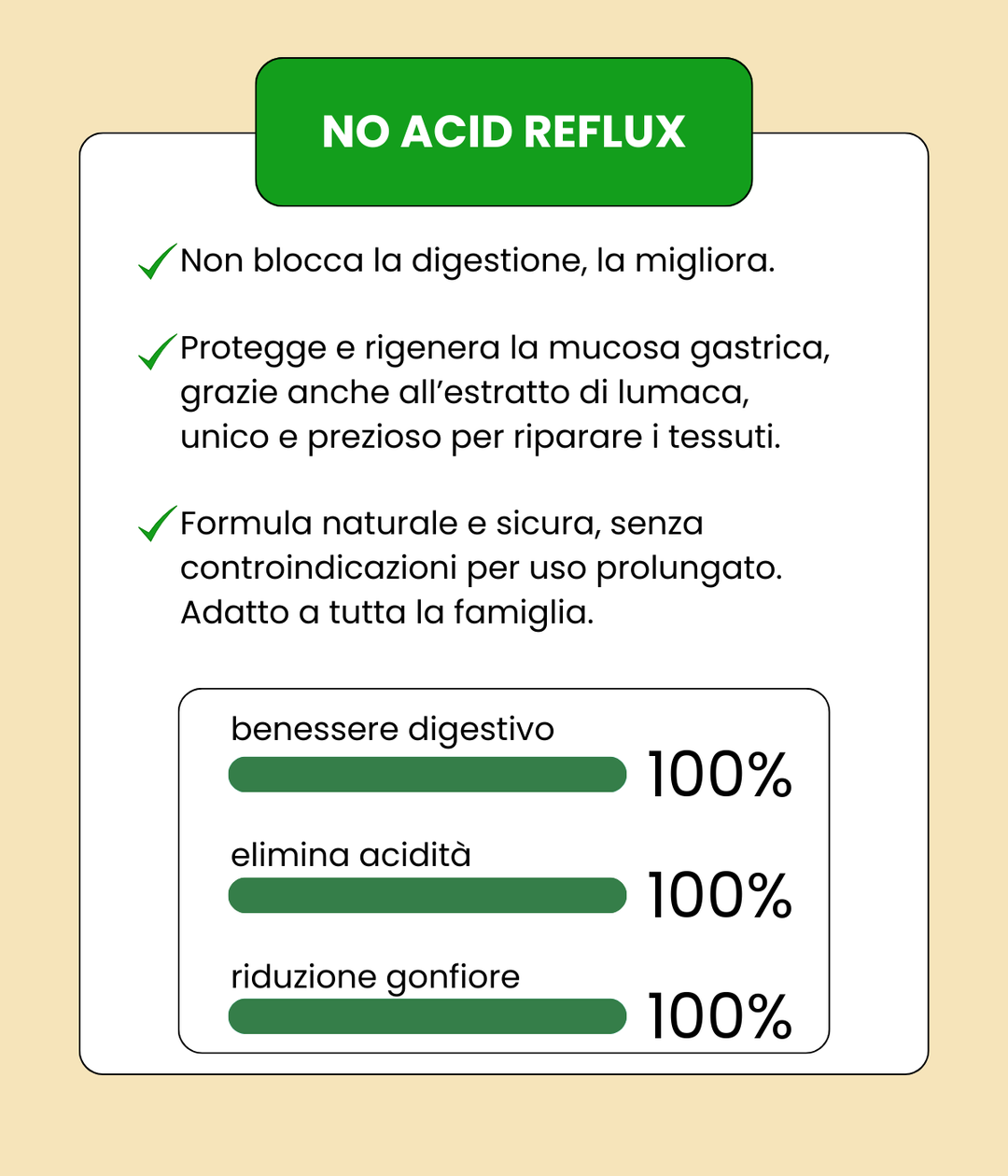 Bruciore, acidità e reflusso possono rendere ogni pasto un problema. Con NO ACID REFLUX hai finalmente una soluzione naturale, sicura e completa: non si limita a bloccare l’acidità come i farmaci tradizionali, ma crea una barriera protettiva nello stomaco, stimola la rigenerazione dei tessuti e migliora la digestione. Grazie a ingredienti come camomilla, liquirizia, angelica, carciofo e l’esclusivo estratto di lumaca, ritrovi sollievo immediato e duraturo, senza effetti collaterali.